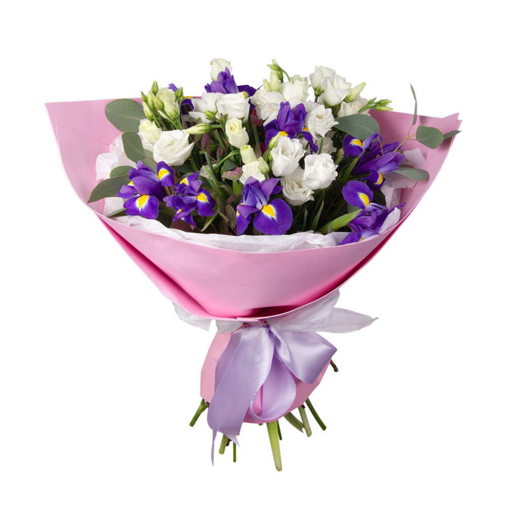 Букет «Подарок» – элегантная композиция из ирисов, эустом и эвкалипта